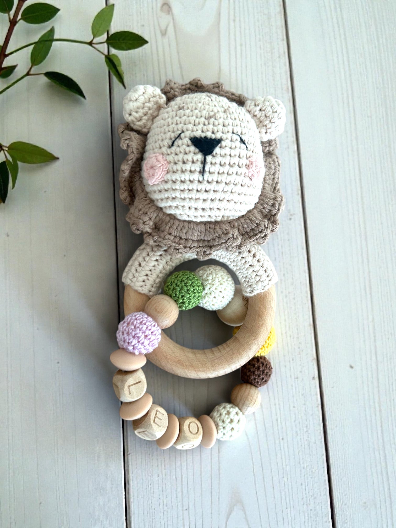 - Die, aufwendig, per Hand gehäkelte Rassel mit Holzring und Löwenkopf/ Löwenmotiv besitzt ein integriertes Glöckchen, dass zum sanft zum Spielen anregt.