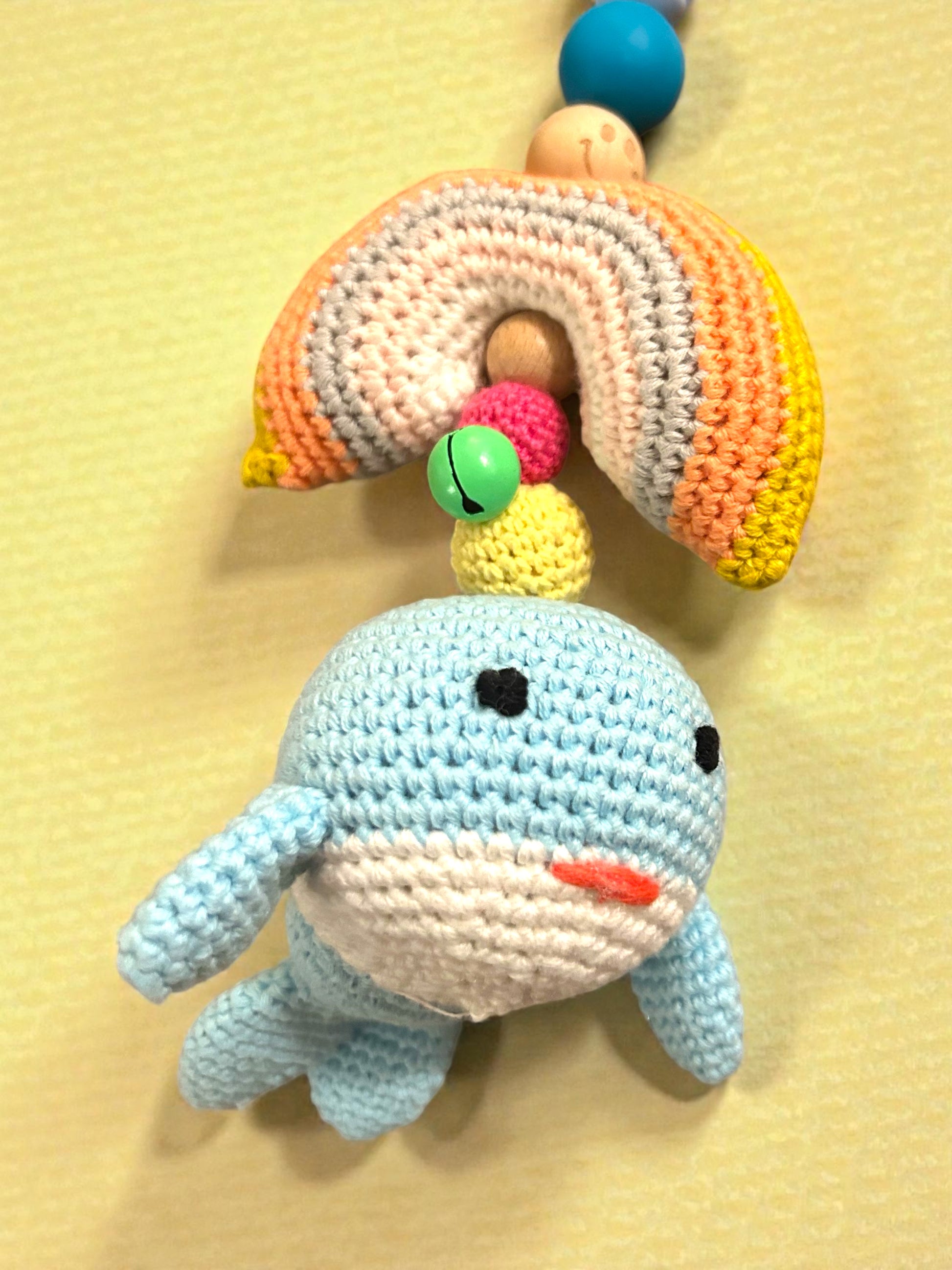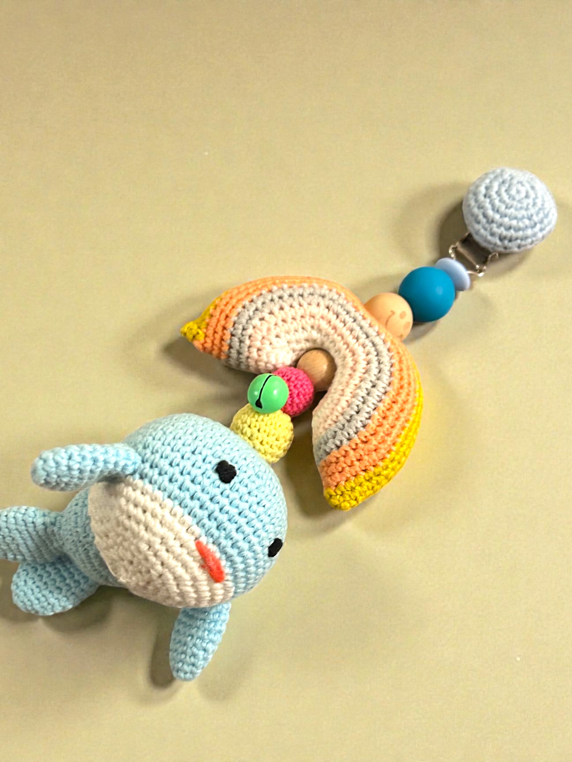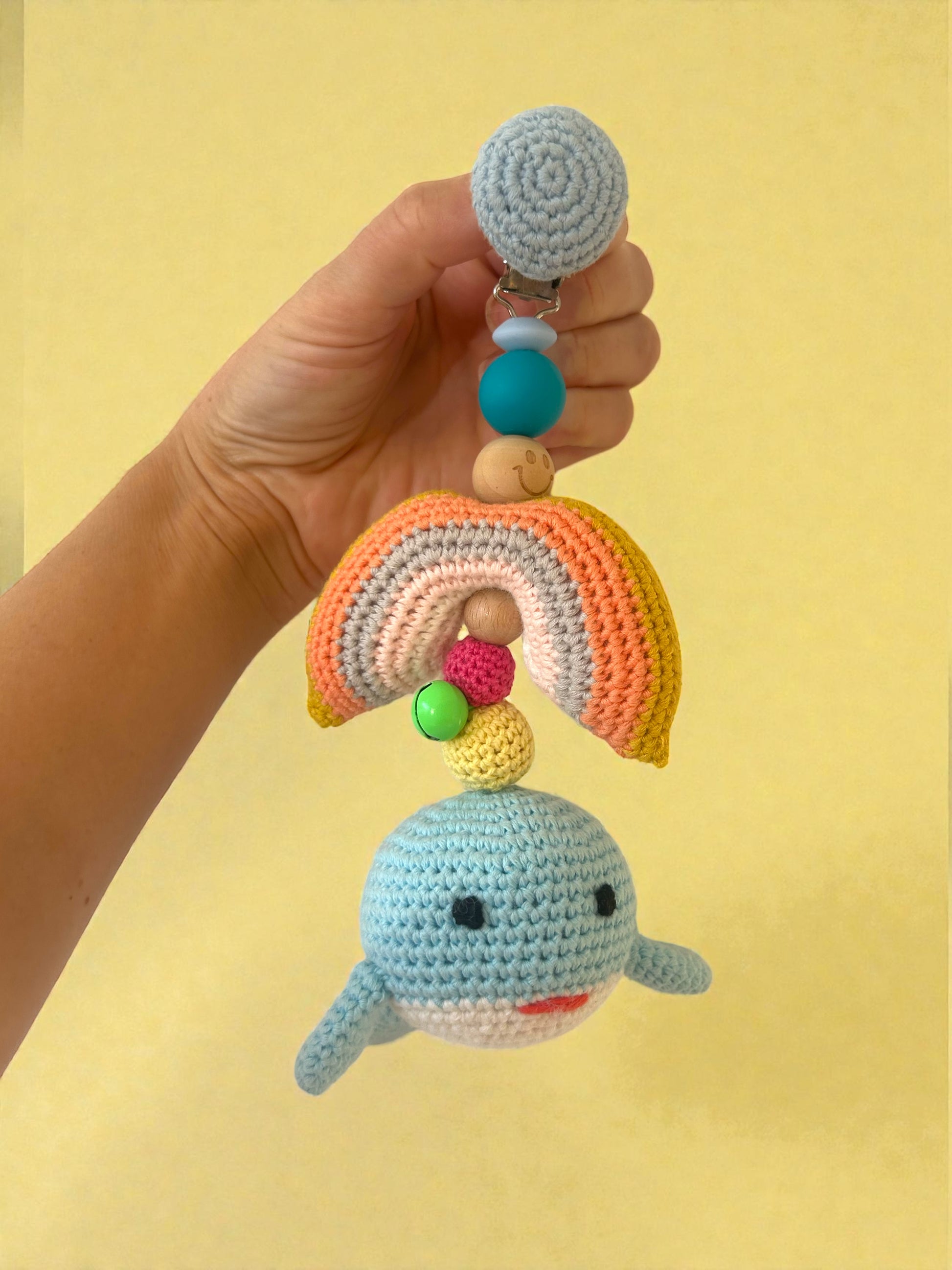 Dieser handgehäkelte Kinderwagenanhänger mit Wal und Regenbogen ist ein liebevoll gestaltetes Accessoire für Babys und Kleinkinder. Mit seinen sanften Farben und der weichen Haptik lädt er zum Anschauen, Greifen und Entdecken ein – ideal für Spaziergänge mit dem Kinderwagen oder die Babyschale.